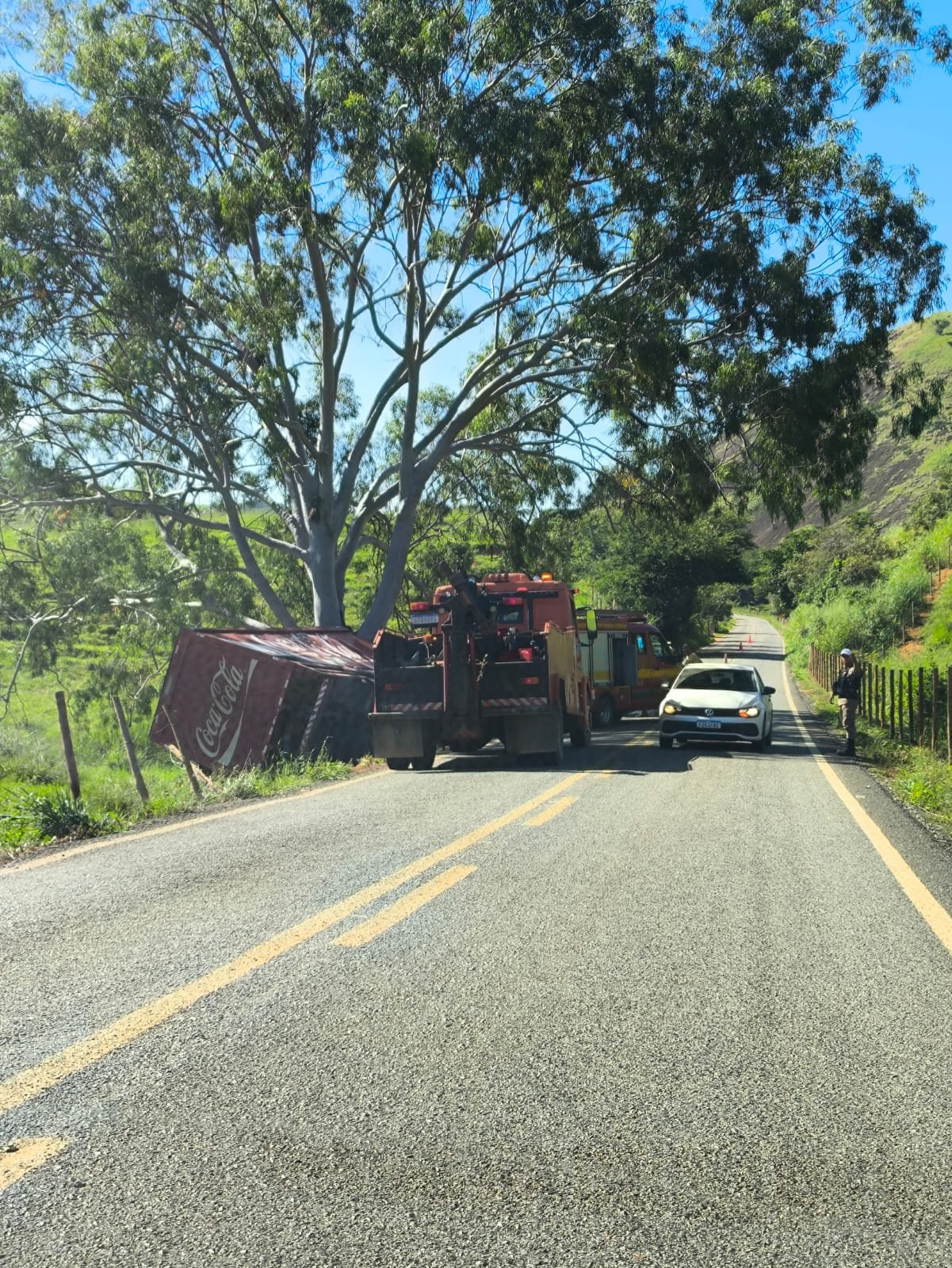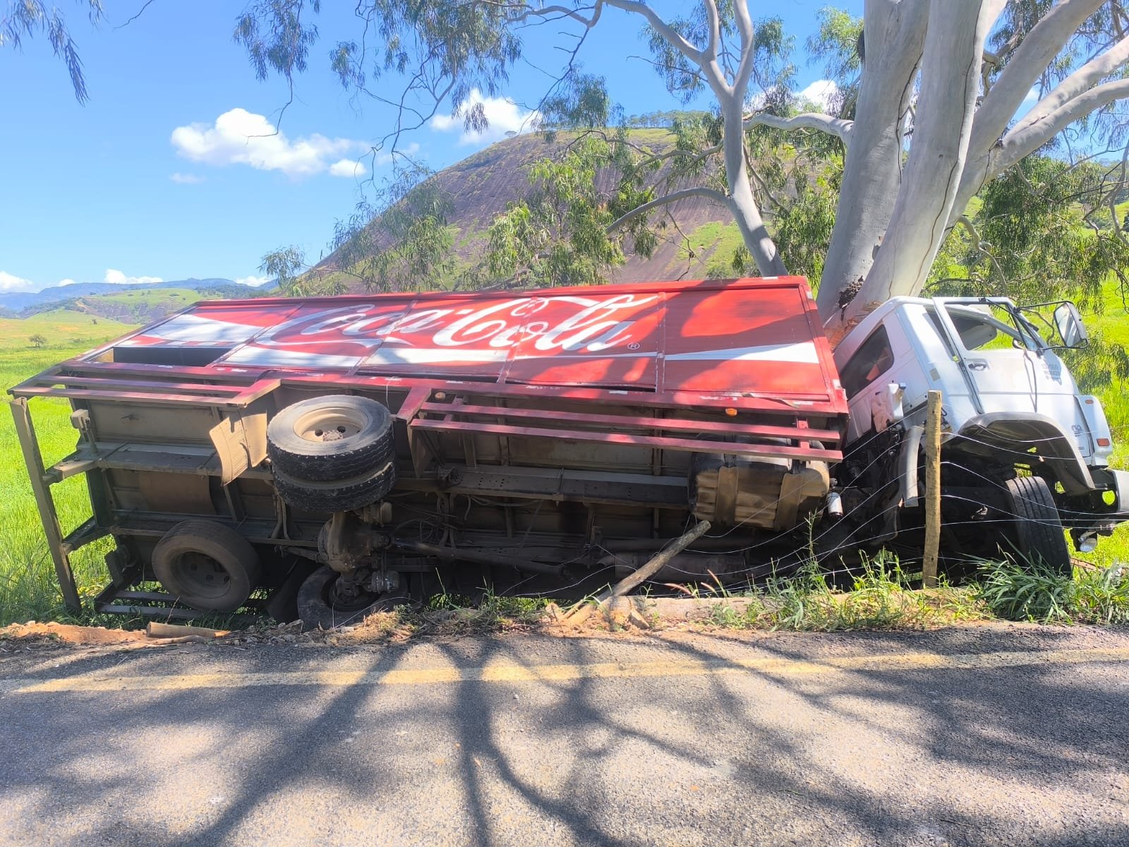 Para evitar a colisão traseira, o motorista tentou reduzir a velocidade, mas não conseguiu engatar a marcha. Com isso, perdeu o controle da direção, invadiu a contramão e saiu da pista, colidindo contra uma árvore de eucalipto. Parte da carga de bebidas foi derramada com o impacto.
