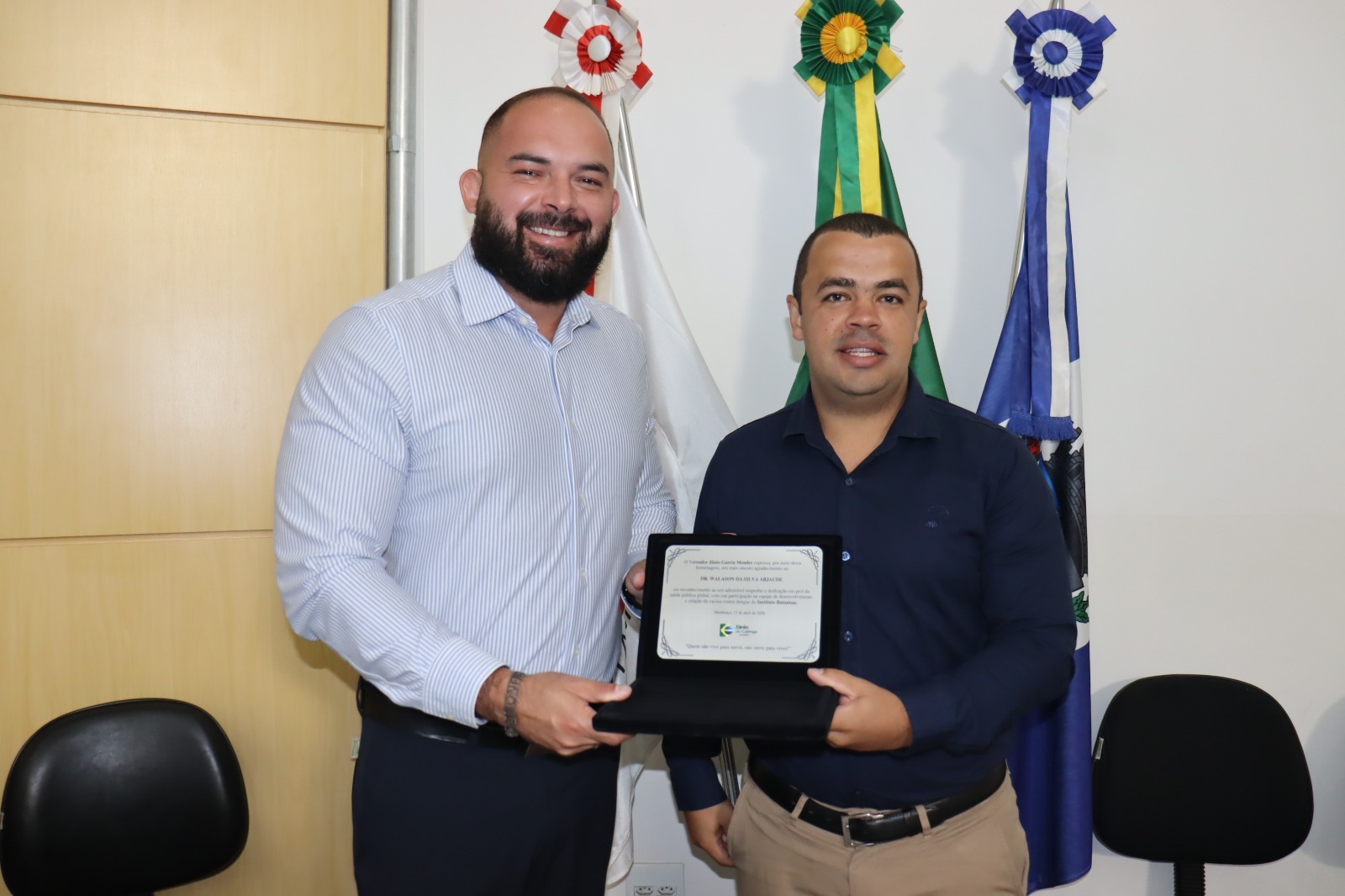 MANHUAÇU (MG) - O pesquisador e biólogo manhuaçuense, Dr. Walason da Silva Abjaude, foi homenageado pela Câmara Municipal de Manhuaçu com Moção de Congratulações, de autoria do vereador Jânio Garcia Mendes (Jânio do Catinga). A entrega da honraria ocorreu em solenidade bastante prestigiada, realizada na tarde desta sexta-feira, 17/04.