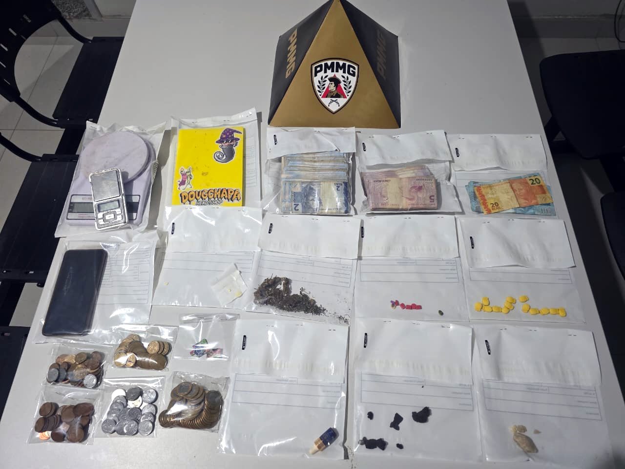 No local, foram apreendidas porções de maconha, haxixe, ecstasy (MDMA) e LSD, além de balanças de precisão, dinheiro e materiais utilizados no tráfico.