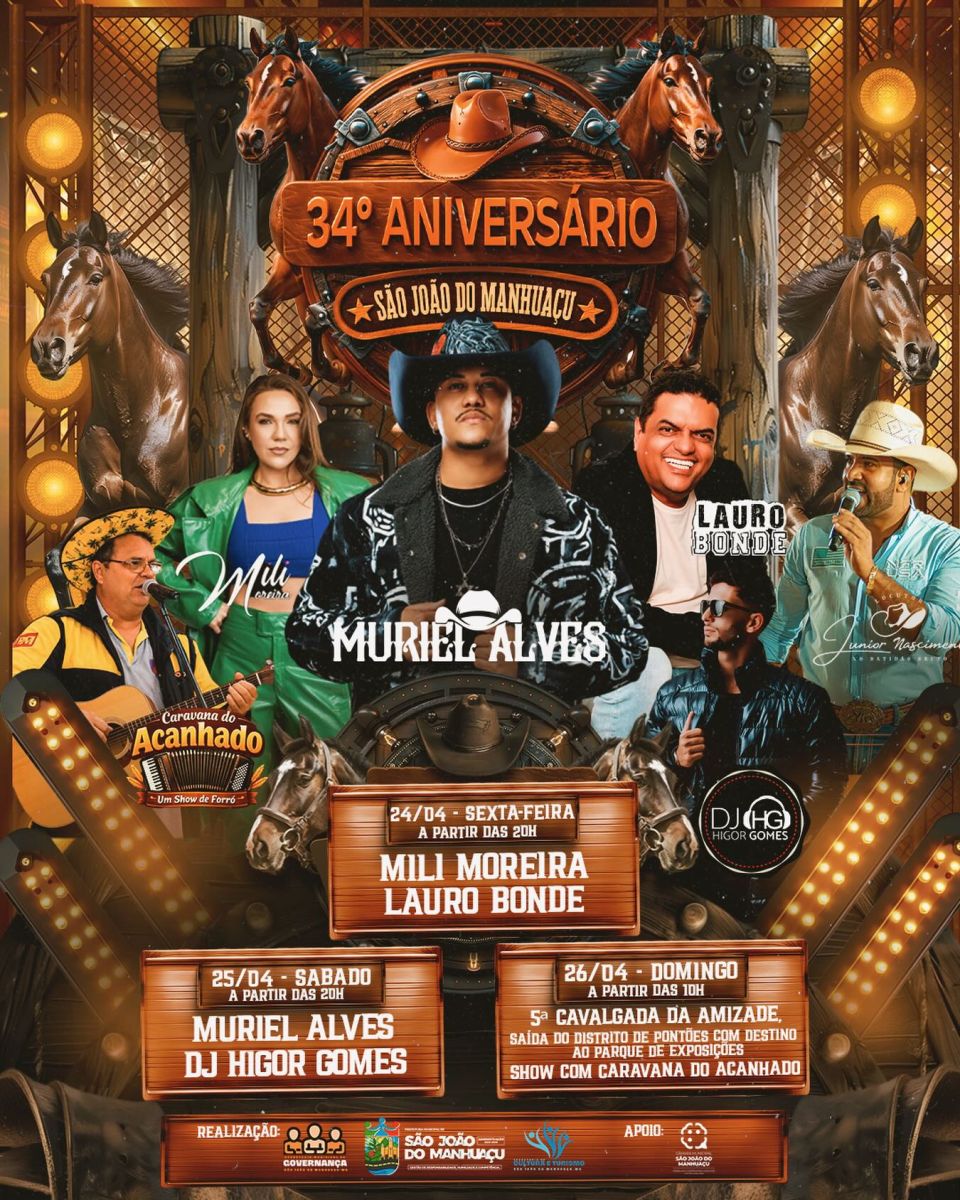 Já no sábado (25), também a partir das 20h, a programação segue com show de Muriel Alves e apresentação do DJ Higor Gomes.