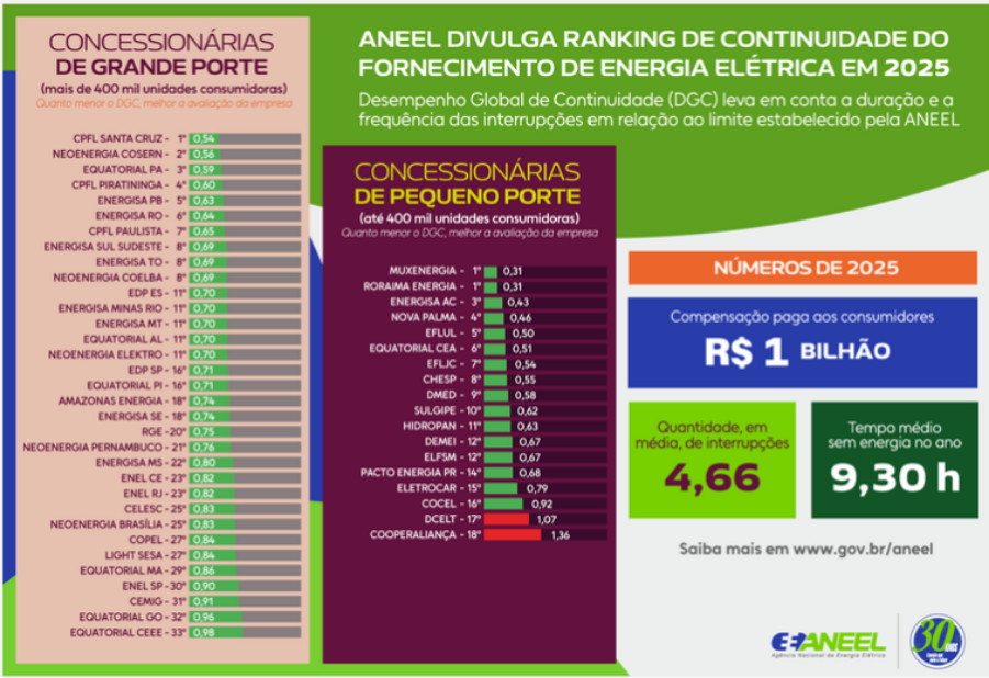 A Energisa Minas Rio atende 65 municípios mineiros e dois do estado do Rio de Janeiro e registrou o melhor desempenho entre todas as distribuidoras que operam nesses dois estados, segundo dados da Aneel. O levantamento considera os indicadores DEC (Duração Equivalente de Interrupção por Unidade Consumidora), que mede o tempo médio que os clientes ficam sem energia, e FEC (Frequência Equivalente de Interrupção por Unidade Consumidora), que aponta quantas vezes, em média, ocorrem interrupções no fornecimento ao longo do ano.
