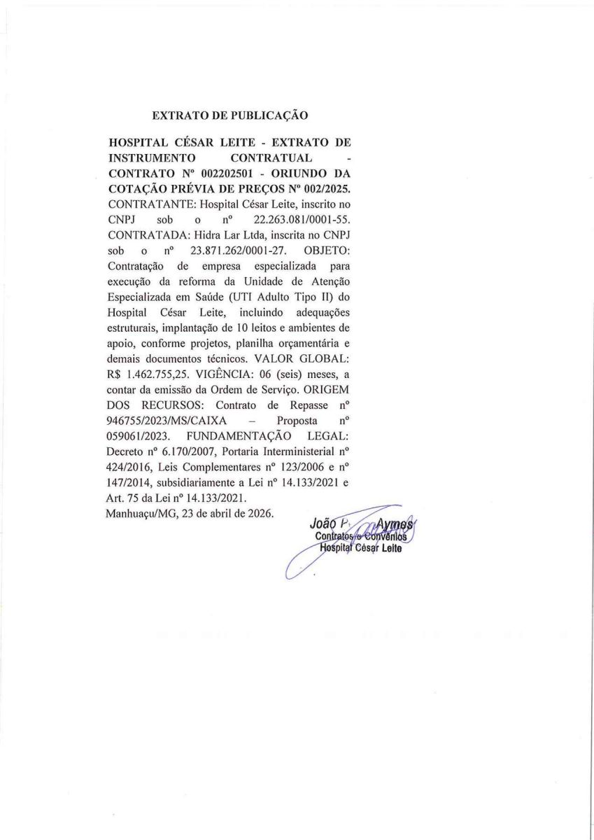 Extrato de Publicação Contrato de Reforma da UTI Adulto II - HCL