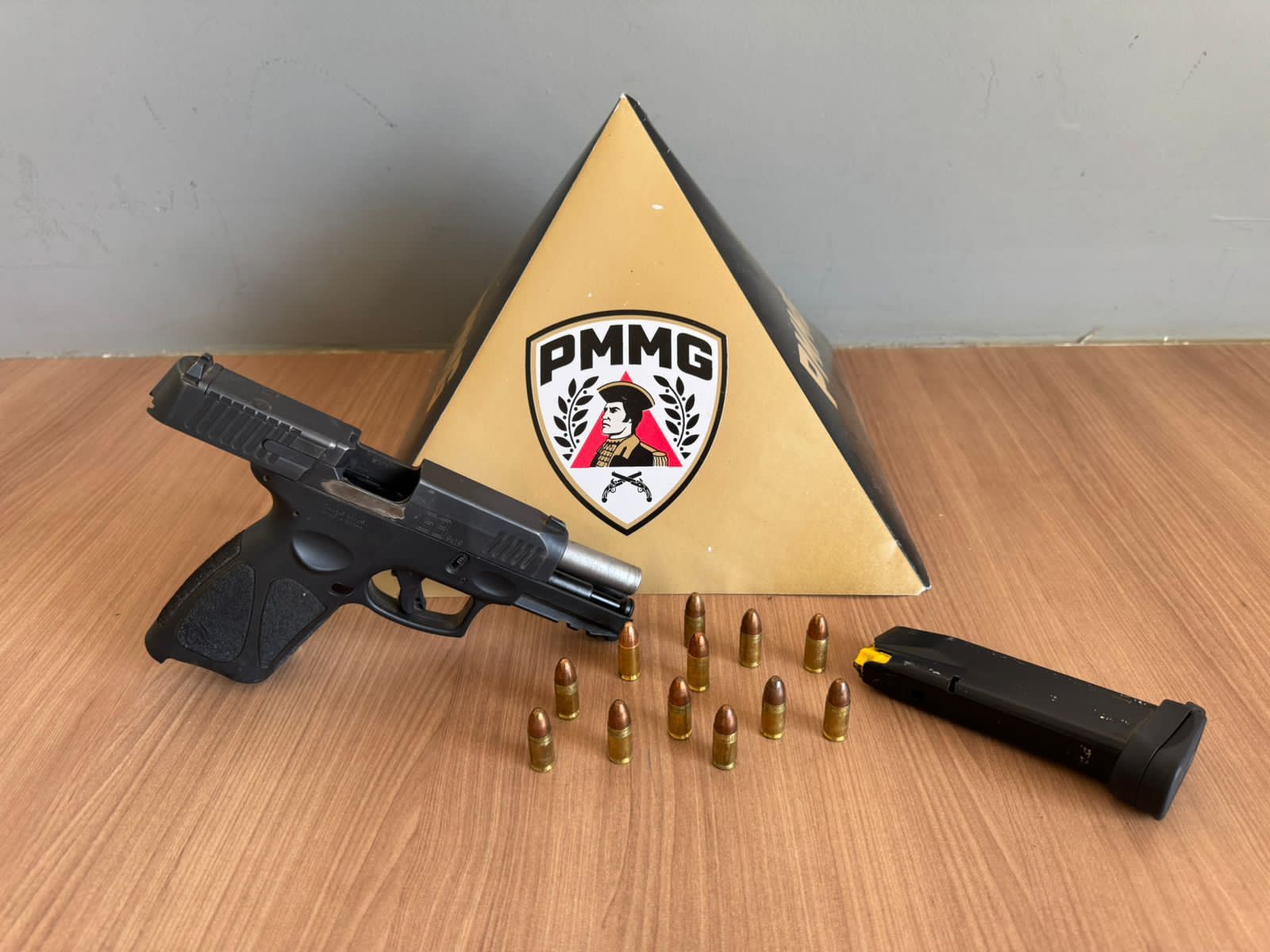 Ao ser realizada busca pessoal no abordado, foi localizada em sua cintura, uma arma de fogo, tipo pistola com numeração suprimida, acompanhada de um carregador contendo 12 munições calibre 9mm intactas.
