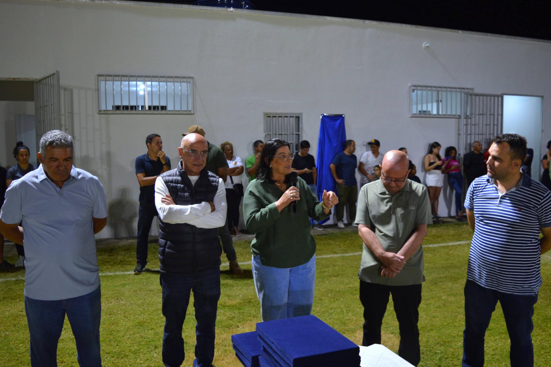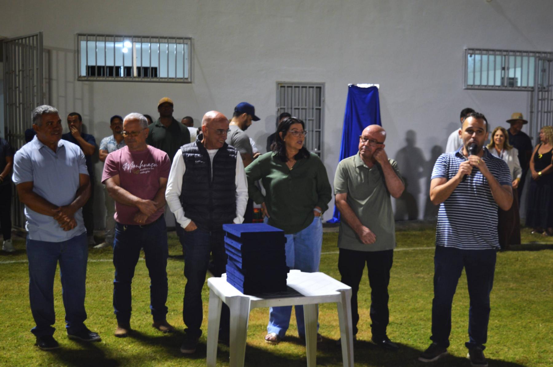VILANOVA / MANHUAÇU (MG) - A noite da última sexta-feira (24/04) entrou definitivamente para a história do distrito de Vilanova com uma celebração que uniu esporte, infraestrutura e reconhecimento comunitário. Em uma cerimônia marcada pela emoção, a Prefeitura de Manhuaçu inaugurou oficialmente o Estádio Municipal Éder Barbosa Porto, transformando o antigo "campão de terra" em uma praça esportiva moderna, agora dotada de gramado de qualidade, iluminação profissional e vestiários novos. A solenidade foi prestigiada pela Prefeita Imaculada, pelo Deputado Federal Mário Heringer, pelo Secretário de Esporte e Lazer Victor Rocha e pela presidente da Câmara, Rose Mary Catta Preta, além de vereadores e secretários municipais.